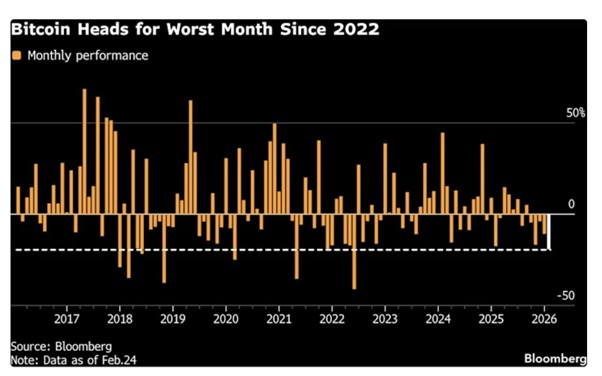 According to a Bloomberg report published in Yahoo! Finance, Bitcoin is on track for its steepest monthly decline since the 2022 TerraUSD collapse. The cryptocurrency fell as much as 3% on Tuesday to approximately $62,557, bringing its total February loss to roughly 24%. This marks the token’s fifth consecutive monthly decline, its longest losing streak since the 2018 “crypto winter.”