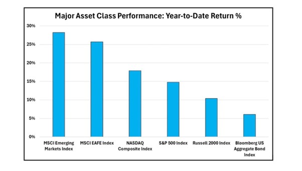 The MSCI Emerging Markets Index outperformed major domestic indices through the first nine months of 2025, surging 28.2% year to date, despite high geopolitical tensions and trade uncertainty. This strong performance is driven by several interconnected global themes and structural factors, with the Chinese market exerting only a limited influence.