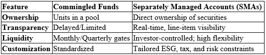 While portable alpha is the strategy, the Separately Managed Account (SMA) is the vehicle, making it viable in 2026. Unlike commingled funds, where an investor is one of many in a pooled “black box,” an SMA offers direct ownership of the underlying securities and a bespoke mandate.