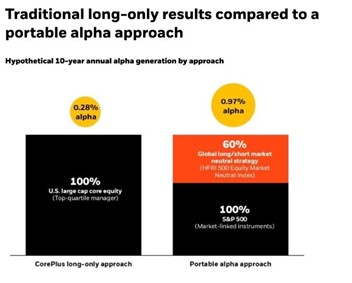 The above is a hypothetical illustration provided by BlackRock of how a portable alpha approach works. This represents model-driven allocations, as depicted above, to the underlying top-quartile (25th percentile) managers in the eVestment Large Cap Core category as of September 30, 2024. The average top quartile manager delivered 0.28% alpha (net) after all fees and expenses have been deducted. In a portable alpha approach, a manager delivered 0.97% alpha (net) after all fees and expenses had been deducted.