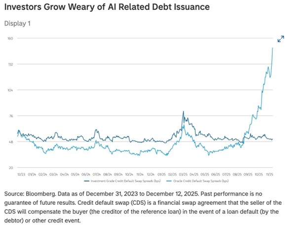 - The AI Nexus: While the AI boom continues, signs of “creative destruction” are appearing. According to Morgan Stanley, this creative destruction will follow signs of excess: where “vast amounts of capital have been spent funding a to-be-determined amount of future revenue”.3Institutional investors are using SMAs to short specific AI “laggards” while maintaining long beta exposure to the broader tech sector. The primary example they cite is Oracle, where the Credit Default Swap spread has far exceeded the average investment-grade CDS spread, raising concerns about Oracle’s ability to realise those revenues and/or service the debt.