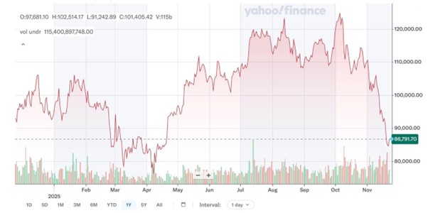 One of the key challenges faced by a Crypto manager is the volatility of the underlying asset and the episodic panic triggered by a range of geopolitical shocks. On the other hand, the very volatility is the basis of the opportunity that cryptos promise. The inherent design of cryptocurrencies makes them highly sensitive to market speculation, monetary policy shifts, and macroeconomic instability. While this volatility offers immense profit potential, it also creates significant tail risks. A major geopolitical event, an unexpected interest rate hike, or a regional banking crisis can send Bitcoin and the broader crypto market into a sharp retreat. For instance, over the last 12 months, Bitcoin has seen wild fluctuations, ranging from $76,273 to $124,752, highlighting its high dependence on external factors.